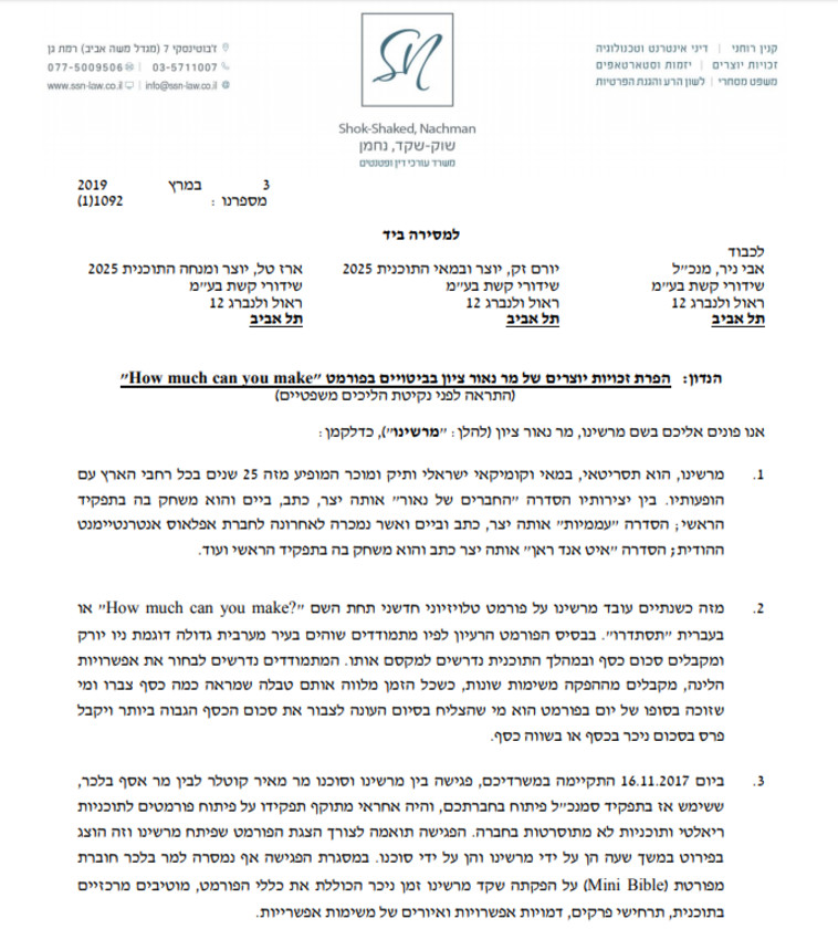 נאור ציון מאיים בתביעה נגד 2025 העתיקו עקרונות מפורמט שלי מעריב